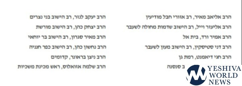The rabbonim include Rabbi Danny Stiskin (former Rav of Maon), Rav Eliav Meir (Rav of the Chevel Modi’in district), Rabbi Shlomo Azoulos (head of a mechina yeshiva), Rav Yitzchak Cohen (Rav of Yishuv Moreshet) and others.