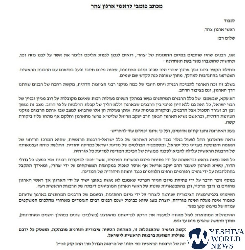 These rabbonim are calling on the Tzohar leadership to refrain from any and all activities that compromise the status of the Chief Rabbinate of Israel, “in line with the vision of Maran HaRav Kook ZT”L”.