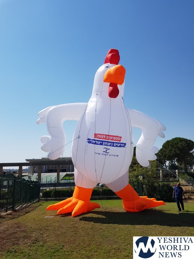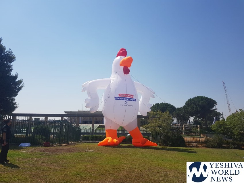A 10-meter high chicken was unveiled outside the Knesset to launch a major protest against Israel’s “cowardice against Hamas and the Palestinian resistance”.