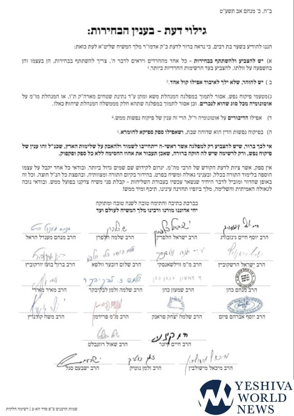Signatories of the letter warn against “losing even a single vote” as it remains imperative to elect another right-wing government, citing one must vote for a party that has a clear chazaka of passing the minimum threshold and entering Knesset. The rabbonim add it is prohibited to vote for a party willing to negotiate the giving away of portions of Eretz Yisrael.
