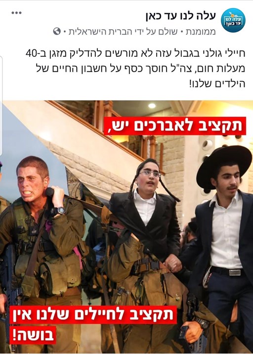One example of a post inciting against Chareidim shows a picture of IDF soldiers with a caption saying, “There’s a budget for avreichim but no budget for our soldiers.”