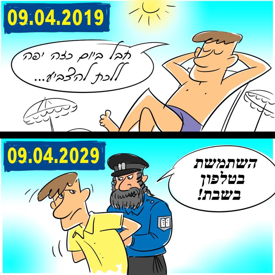 Another example shows a cartoon of a secular man on voting day opting to relax on the beach rather than heading to the voting booth. Ten years later, the same man is arrested by a Chareidi policeman for using his phone on Shabbos. The cartoon echoes the calls of politicians such as Blue and White leader Yair Lapid and Yisrael Beiteinu chairman Avigdor Liberman, who constantly warn the public that if the Chareidim enter the government, Israel will turn into a “halachic state.”
