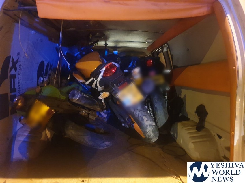 When the van he was driving was inspected, four stolen motorcycles/scooters were found, stolen last week from the Gush Dan area. One of the stolen vehicles was a United Hatzalah emergency response scooter.