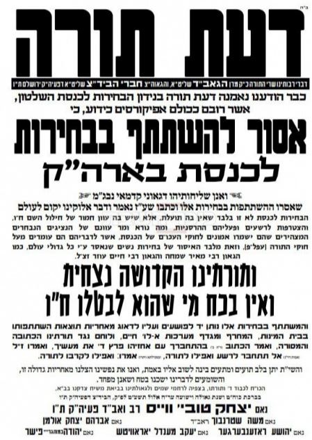 The letter adds that anyone participating in election is in actuality, fighting against the Torah HaKedosha and tradition.