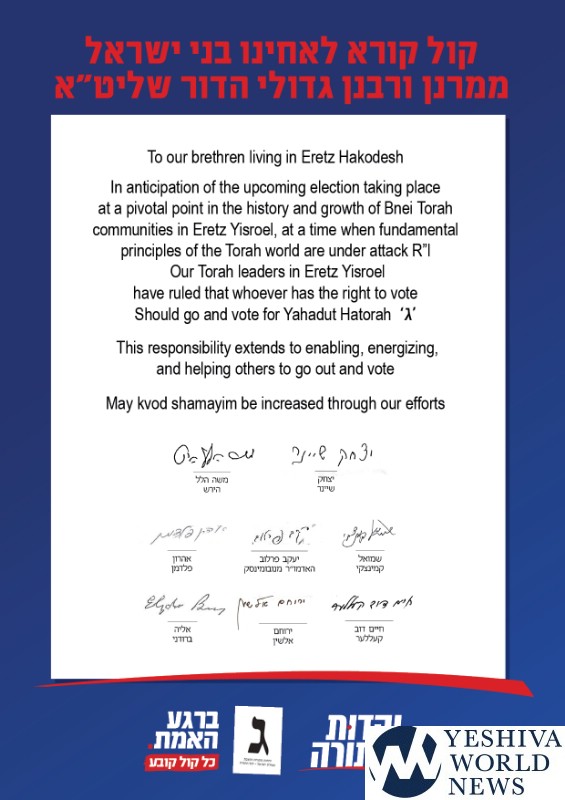 With the election for Israel’s 22nd Knesset just days away, Gedolei Torah in the United States join the Gedolim in Eretz Yisrael, calling on the tzibur to cast a ballot for Yahadut Hatorah, at a time “when fundamental principles of the Torah world are under attack R”L”.