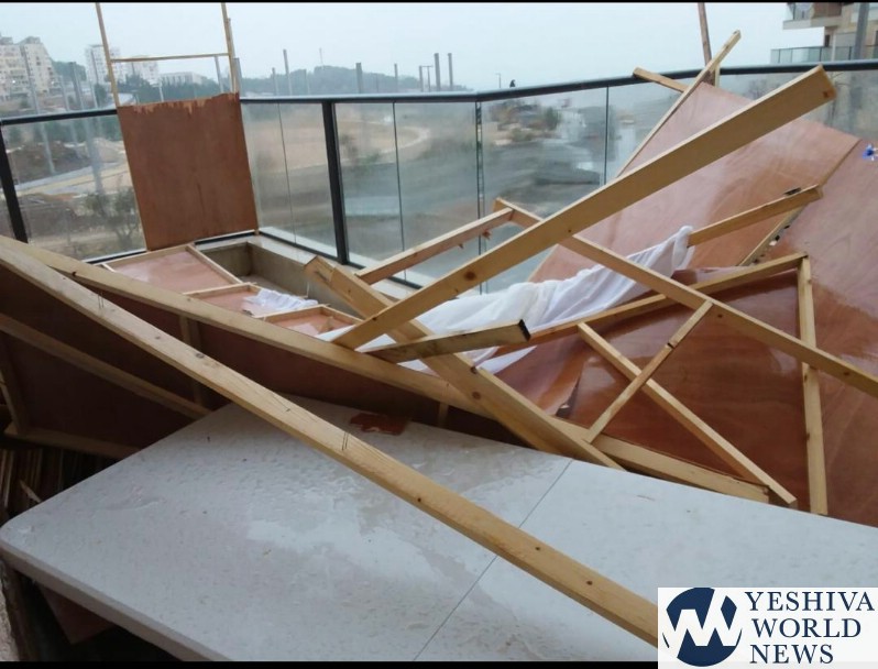 On Tuesday, as the storm hit its peak and torrential rains poured down across Eretz Yisroel, all of the sukkos in the community were destroyed. Many pergolas, as well as steel enforced balcony covers, were also destroyed by the strong winds and rain. After the storm passed, more than 200 sukkahs were completely destroyed. Chief Rabbi of Nof HaGalil Rabbi Yona Herzl, who lives in the community said that he has not seen a storm cause damage like this in the more than 40 years that he has been a resident of the city. Rabbi Herzl’s Sukkah was also destroyed.