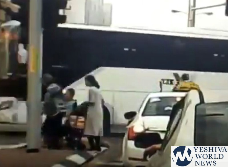 One can see in the accompanying video that at the last second, a chareidi mother saved her toddler son from being struck by a bus