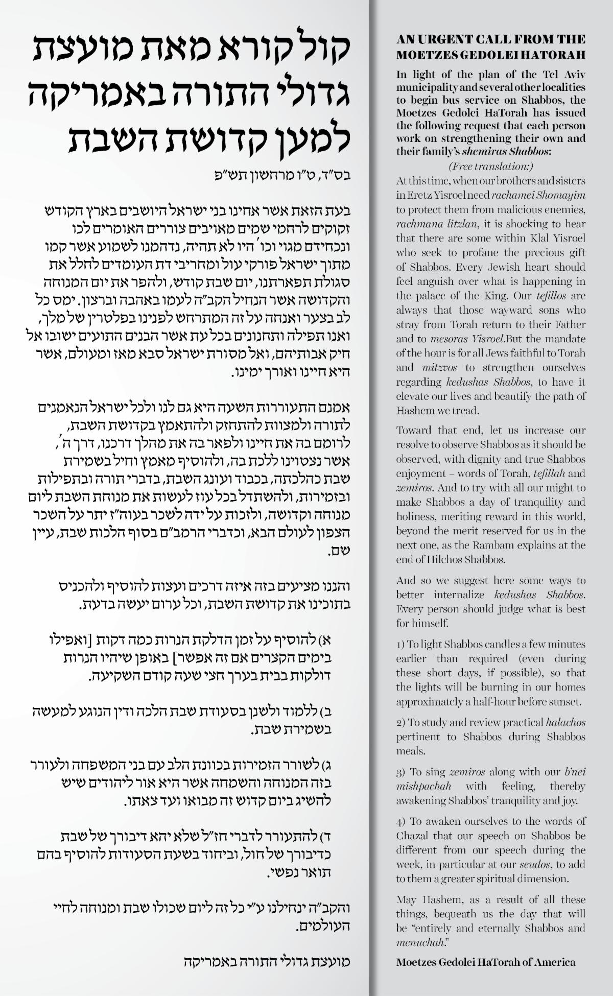 In light of the plan of the Tel Aviv municipality and several other localities to begin bus service on Shabbos, the Moetzes Gedolei HaTorah has issued the following request that each person work on strengthening their own and their family’s shemiras Shabbos.