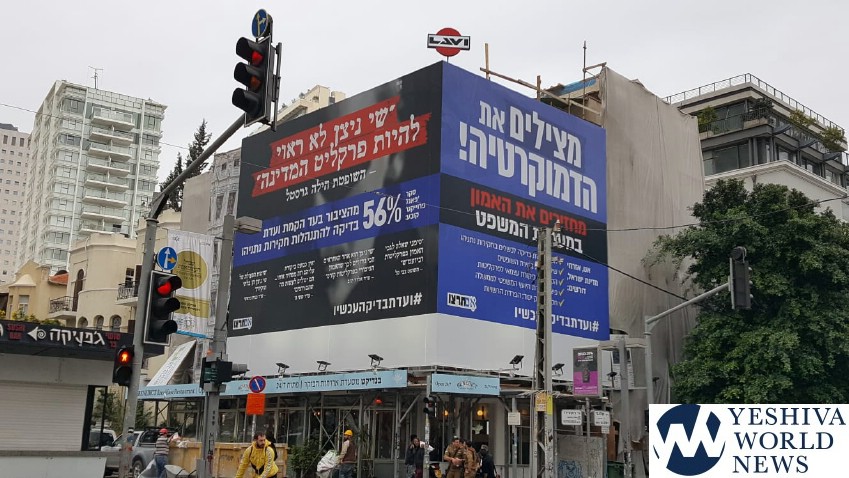 A giant billboard calling to “Save Israel’s Democracy” by instituting judicial reforms was put up on Thursday in the heart of Tel-Aviv on the corner of Rothschild Boulevard and Allenby Street.
