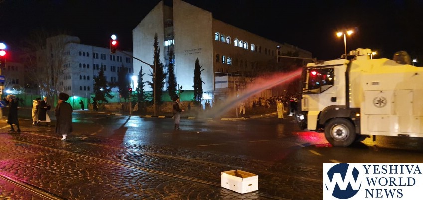 Police used water cannons loaded with blue dyed water to distance protestors, with chassidim reporting the water cannon was directed in the area where the rebbe stood. This led to a wild response until the protest broke up hours later. Elsewhere in Jerusalem, there was a protest outside the taxi stand on HaNevi’im Street.