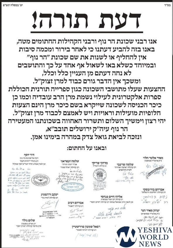 Rabbonim released a kol korei expressing their opposition to changing the name of Har Nof to ‘Neot Yosef’ in memory of Maran HaGaon HaRav Yosef Sholom Elyashiv ZT”L and Maran HaGaon HaRav Ovadia Yosef ZT”L – which Jerusalem Mayor Moshe Leon plans to do.