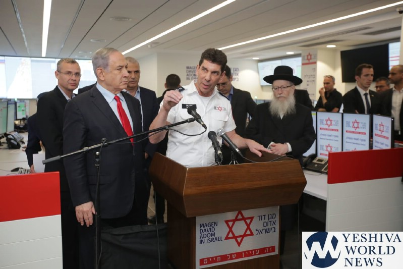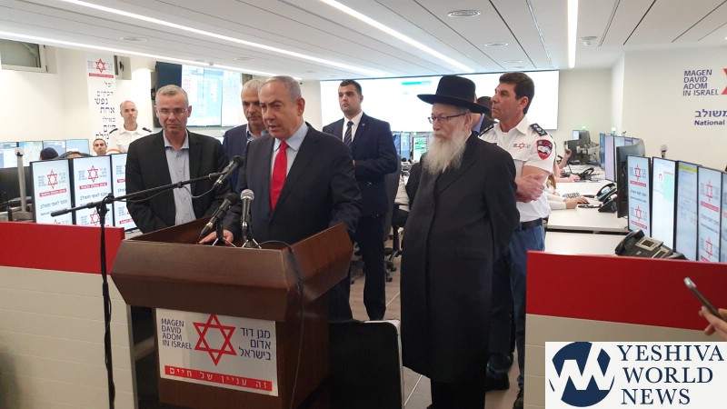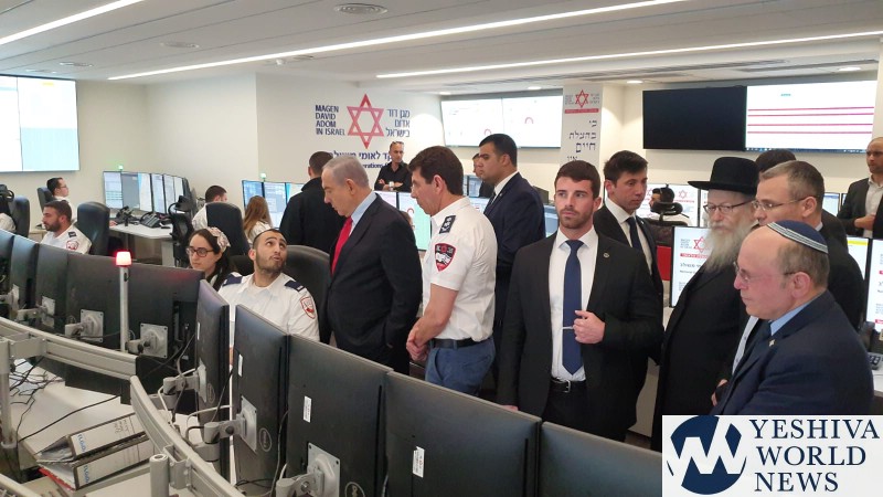 PM Benjamin Netanyahu arrived on Thursday to visit MDA’s National Operations Center in Kiryat Ono, where a joint call center for Magen David Adom and the Ministry of Health was established on Saturday night specifically to deal with the Coronavirus. The Prime Minister was accompanied by Minister of Health Rabbi Yaakov Litzman, Finance Minister Moshe Kahlon, Minister of Tourism Yariv Levin, Chairman of the National Security Council Meir Ben Shabbat and the Director General of the Ministry of Health Moshe Bar Siman Tov.
