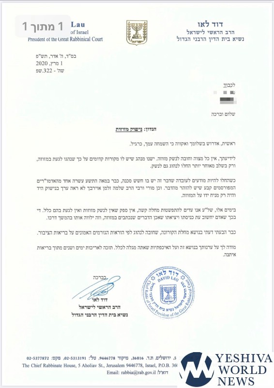 Harav Dovid Lau, the Chief Rabbi of Israel, paskened that no one should kiss or even touch mezuzahs due to the spread of the coronavirus, Israeli media outlets reported on Wednesday.