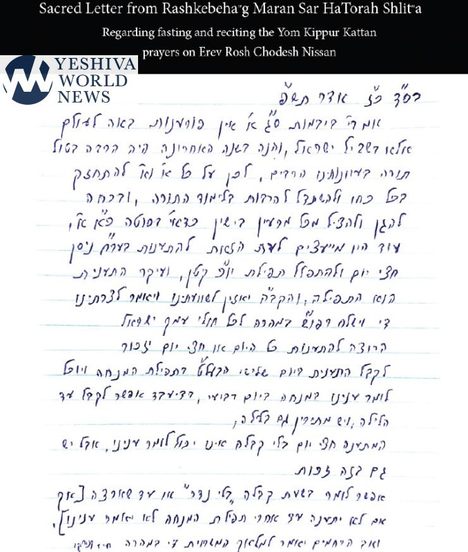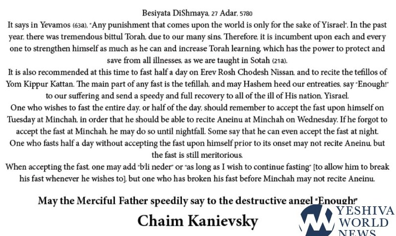 Hagaon Harav Chaim Kanievsky called for the public to fast for half a day on Wednesday, Erev Rosh Chodesh Nissan in a special letter published in the Hebrew Yated Ne’eman on Monday morning.