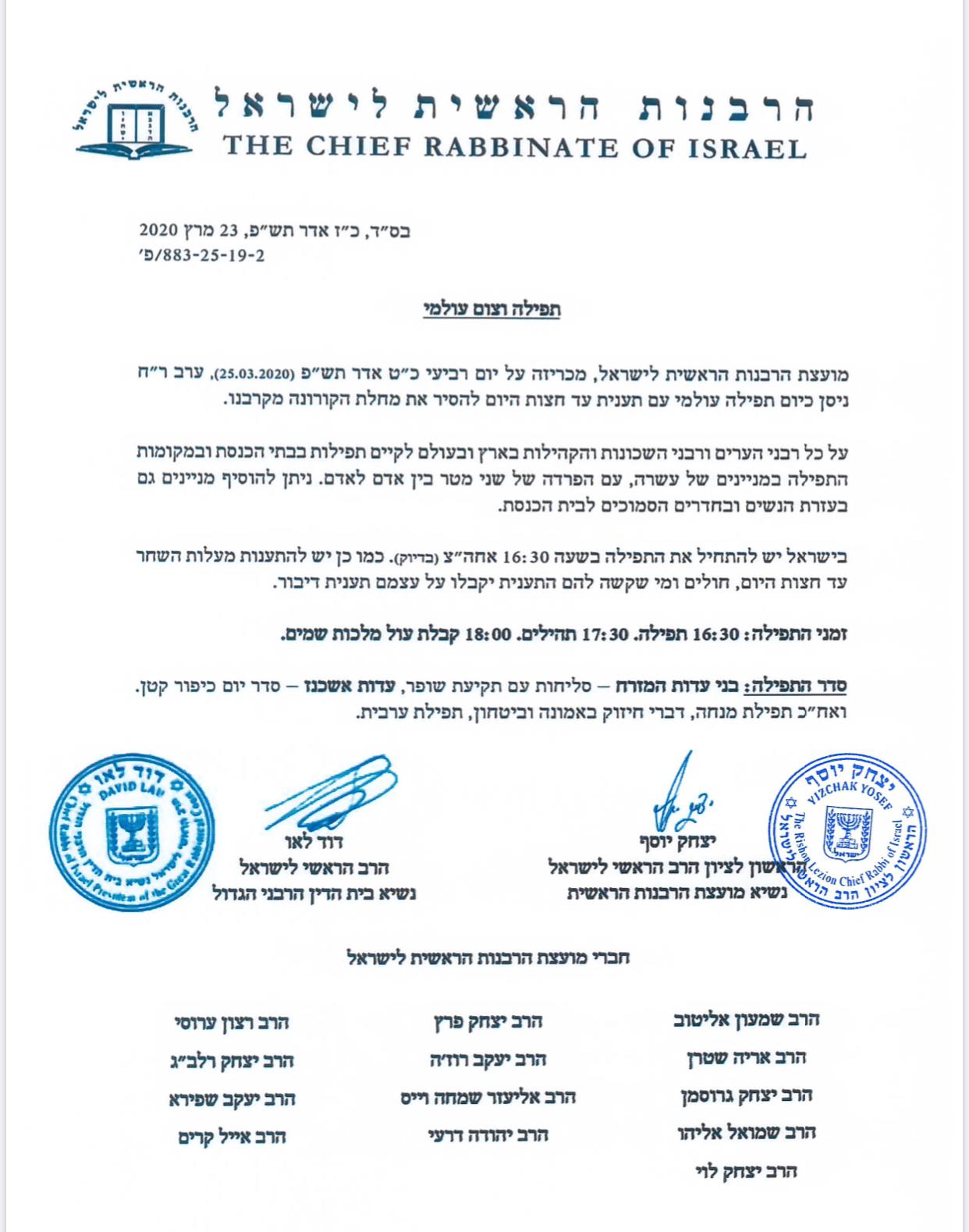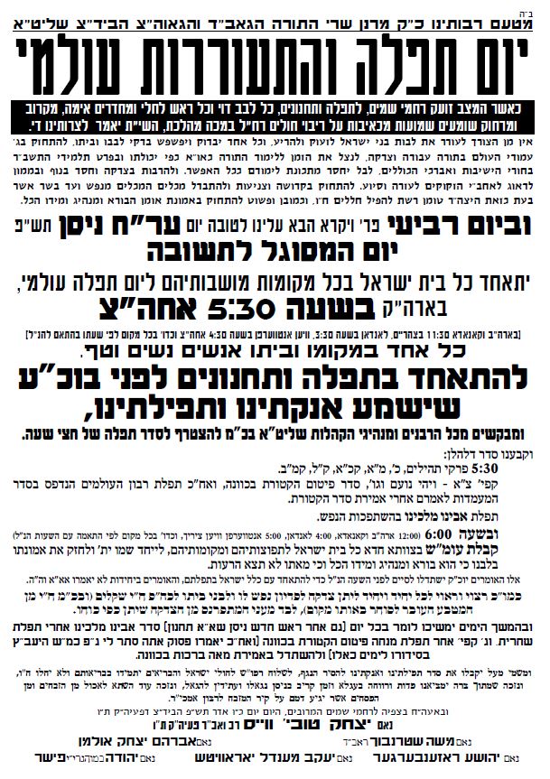 “Also, it is recommended at this time to fast a half a day on Erev Rosh Chodesh Nissan and to recite the Tefillas of Yom Kippur Katan, and the ikar of a taanis is Tefillah. The main part of any fast is the Tefillah, and may hashem listen to our cries and say enough to our tzaros and send a speedy refuah shleimah to all cholei amcha Yisrael.”