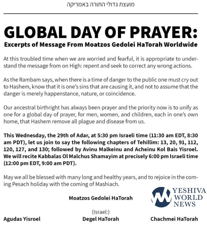 The Meotzos Gedolei Yisrael in Israel and the United States are calling for a rare shared call for tefillah on Wednesday, Erev Rosh Chodesh Nissan, for an international cry to Hakadosh Baruch Hu to end the coronavirus pandemic. The Kol Koreh was signed by the Moetzes Gedolei HaTorah of Agudas Yisroel of the United States, the Moetzes of Degel HaTorah, the Moetzes of the Agudah in Eretz Yisroel (Admorim), and the Moetzes Chachmei HaTorah (Shas).