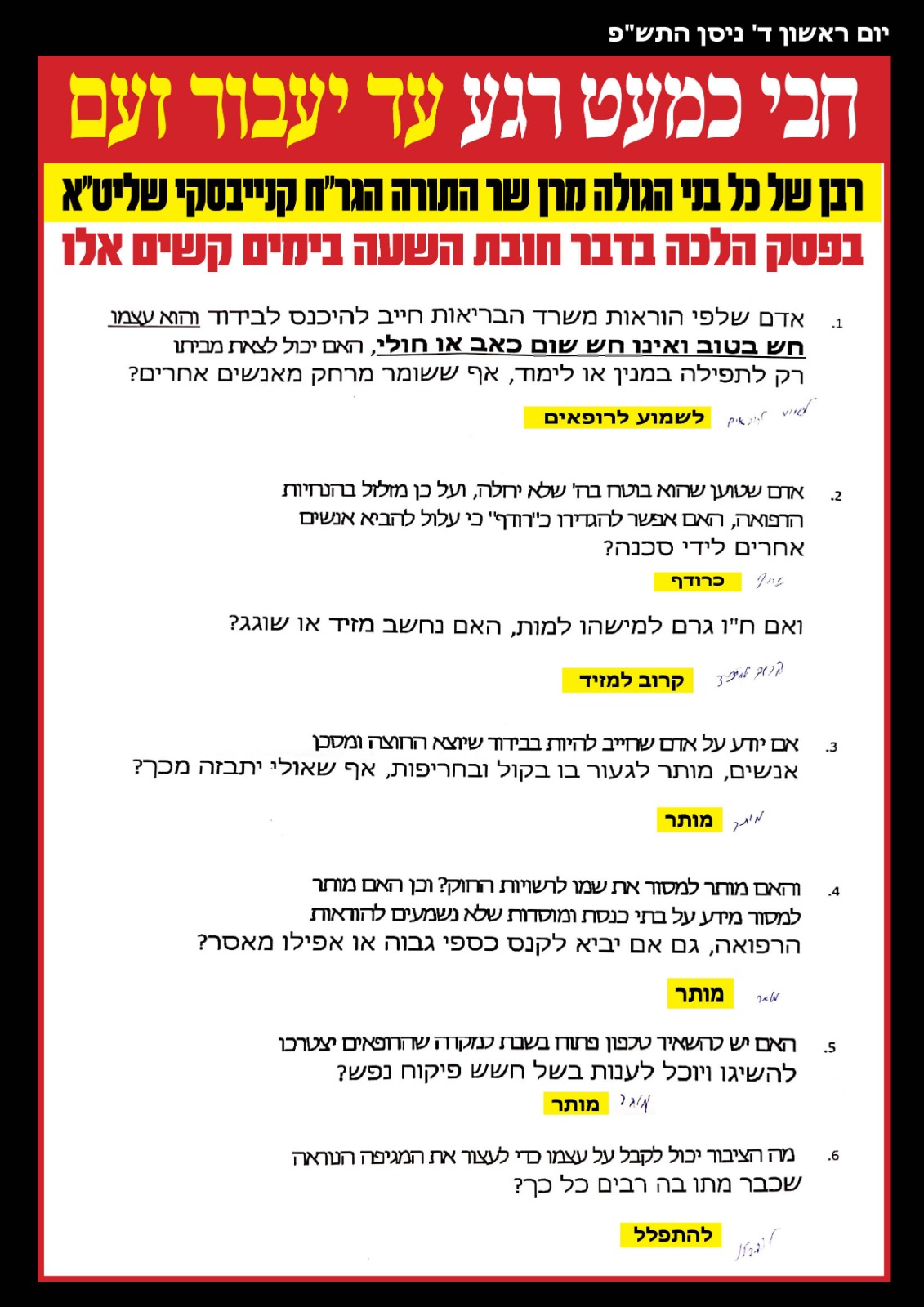 Harav Chaim also condemned anyone who violates Israel’s Health Ministry directives, saying that such a person has a din of a rodeif and paskened that it’s permissible to report shuls or institutions that violate Health Ministry directives to the police even if the gabbaim will be required to pay heavy fines or even face imprisonment.