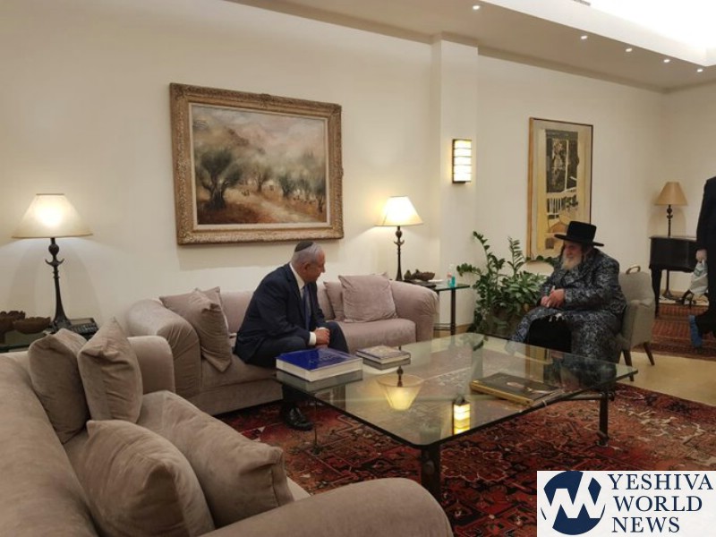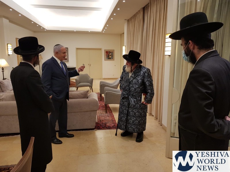 In a rare occurrence, the Vizhnitzer Rebbe held a personal and historic meeting with Prime Minister Binyamin Netanyahu at his Balfour Street Residence in Yerushalayim. According to reports by Kol Baramah reporter Yisroel Cohen, the purpose of the meeting was to gain assurance from Netanyahu that the status quo with regards to religious issues and the Conscription law will stay the same, ahead of the signing of the coalition agreement between the Likud and the UTJ.