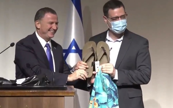 Health Minister Yuli Edelstein gave outgoing director-general Moshe Bar Siman Tov a gift of a Hawaiian shirt and flip-flops, saying that since he’s between jobs and the prime minister said that flights may resume soon, they may come in handy.