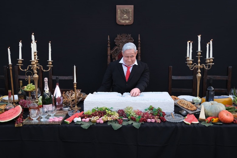 Tel Aviv residents then woke up to a different type of anti-Netanyahu demonstration on Wednesday morning. A protestor had erected a life-sized art exhibit of Netanyahu sitting at a “fancy dinner” table set with abundant food and drink and digging into a large cake with a depiction of the Israeli flag on it. The table also held large sums of cash, empty liquor bottles and a cigar, a reference to Netanyahu’s ongoing legal woes.