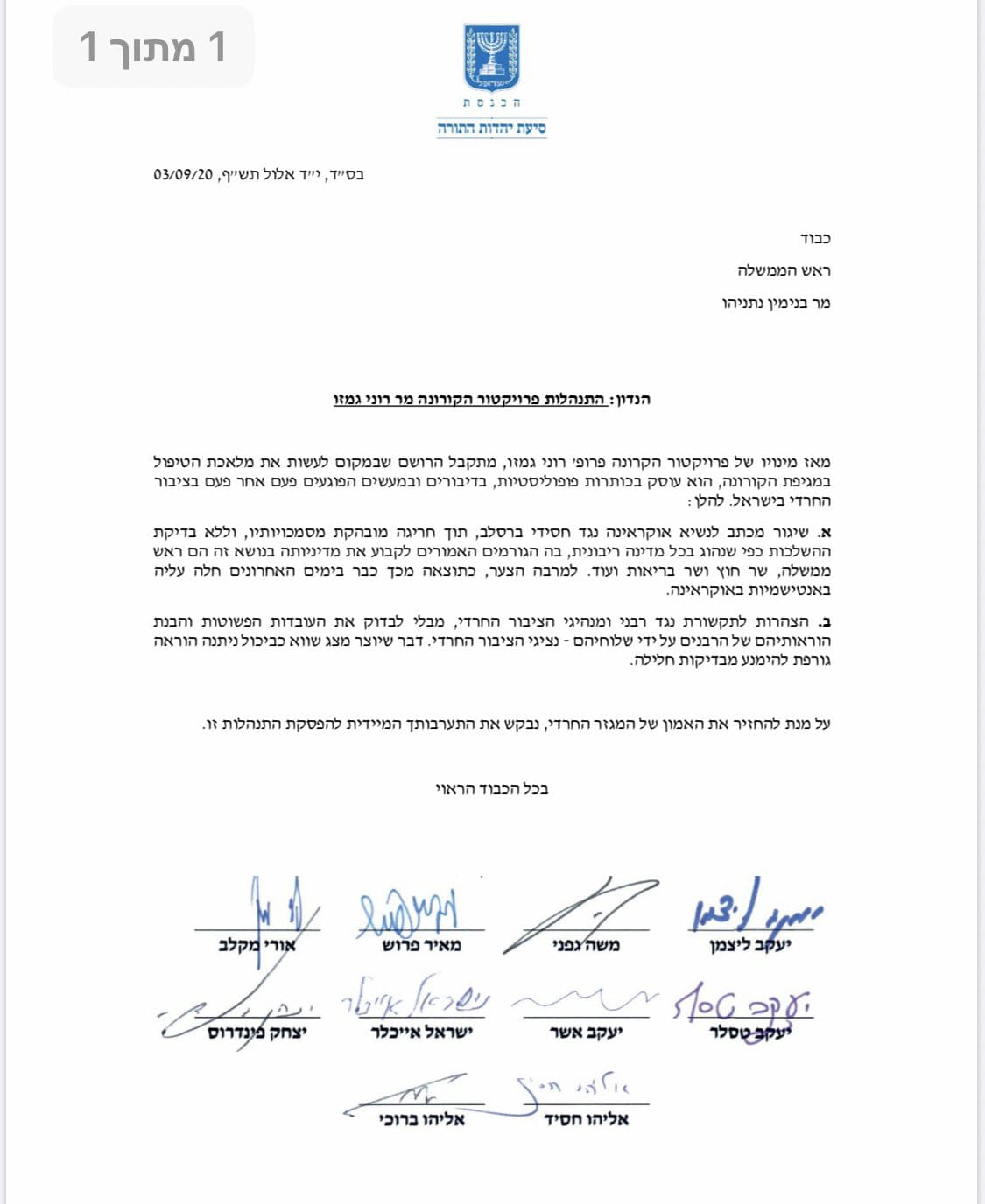 Following the letter sent by Coronavirus Commissioner Ronni Gamzu to the Ukrainian government, as well as his comments regarding the statement about Hagaon HaRav Chaim Kanievsky yesterday, the MKs from the UTJ party got together and sent a letter to Prime Minister Binyamin Netanyahu asking him to intervene and stop Gamzu from constantly attacking the Charedi community.