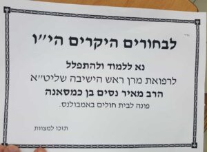 Signs were hung up in Yeshivas Kisei Rachamim in Bnei Brak asking his talmidim to learn and daven for a refuah sheleimah.