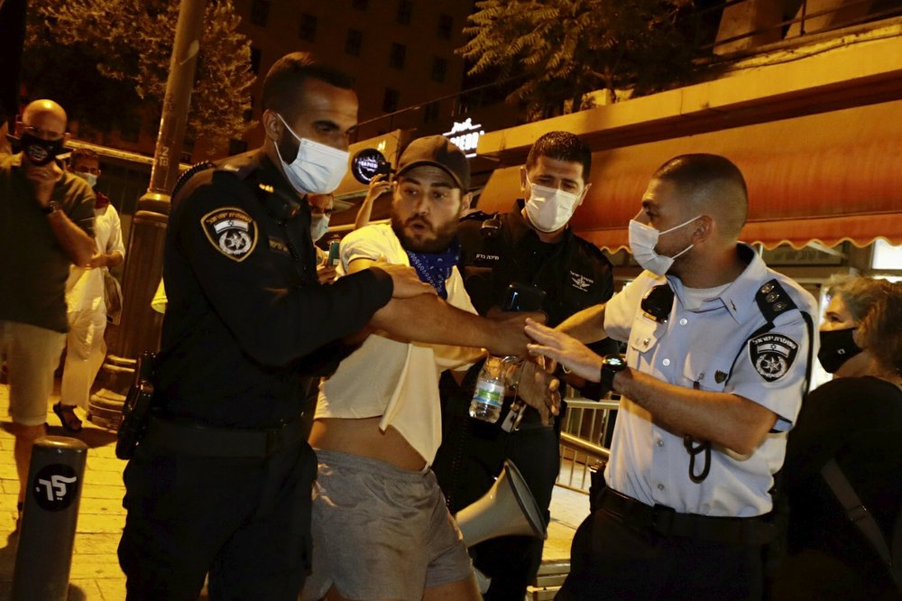 Israeli police officers detain a protester during a demonstration against Israeli Prime Minister Benjamin Netanyahu near the Prime Minister's residence in Jerusalem, Sunday, Sept. 20, 2020. (AP Photo/Sebastian Scheiner)