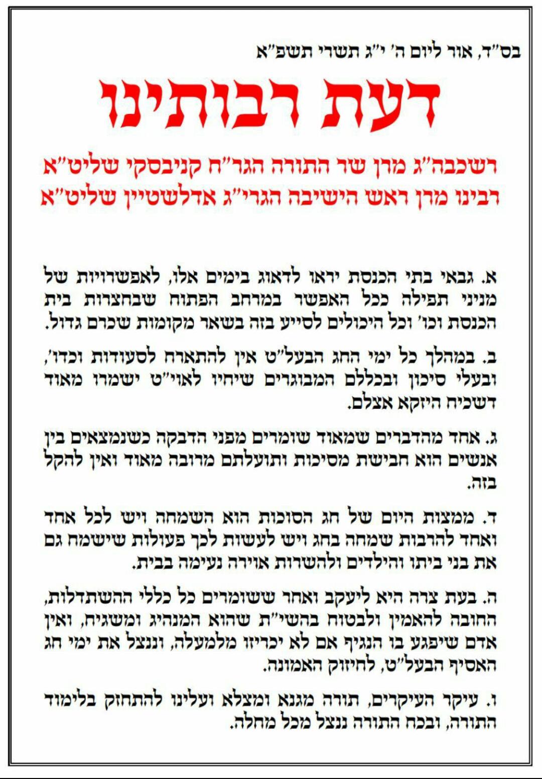 In a special letter published on Wednesday evening, Hagaon HaRav Chaim Kanievsky and Rosh Yeshivah HaRav Gershon Edelstein called for tefillos to take place outdoors and to refrain from hosting guests during Sukkos.