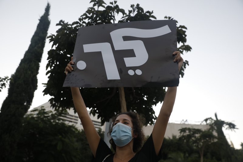 A woman holds a placard that reads, "go," during a protest against Prime Minister Benjamin Netanyahu in Tel Aviv, Israel, Thursday, Oct. 8, 2020 during a nationwide lockdown to curb the spread of the coronavirus. The Israeli government has extended an emergency provision that bars public gatherings, including widespread protests against Netanyahu, for an additional week. (AP Photo/Ariel Schalit)