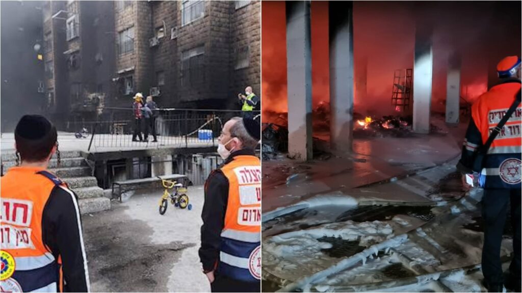 The fire began in a storage room on the bottom of a complex of six residential buildings on Rechov Sorotzkin and quickly spiraled out of control, spreading to nearby cars, apartments and additional storage rooms. Dozens of families were caught in the buildings, unable to escape due to the fire and heavy smoke.