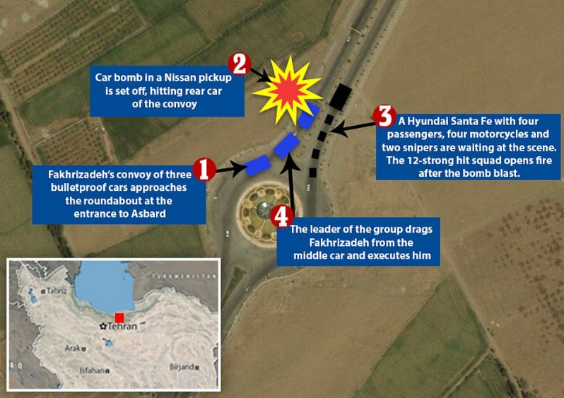The team was aware that Fakhrizadeh was planning on driving from Tehran to Abasard on Friday. They planned the attack at a traffic circle on a boulevard that enters the city. When the nuclear mastermind’s car entered the traffic circle, two snipers, four motorcycles, and a car with four passengers were waiting in ambush with him along with a booby-trapped Nissan pickup.
