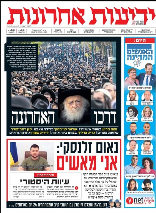 And Maariv also covered the funeral, blaring a headline saying “Kavod Acharon” for the incalculable loss of the leader of a generation.