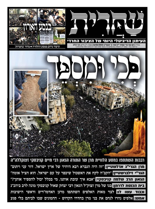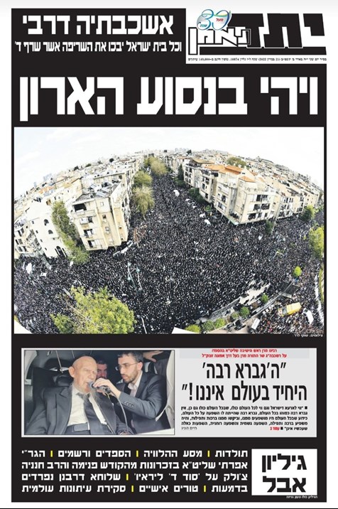 Shacharit, another paper, devoted their front page to coverage of the levaya, including an obituary of the revered Rav Chaim zt”l.