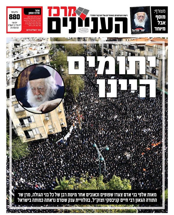Merkaz Ha’Inyanim, a free weekly paper, printed a full supplement to report on the levaya, with the headline “Yesomim Hayinu.”