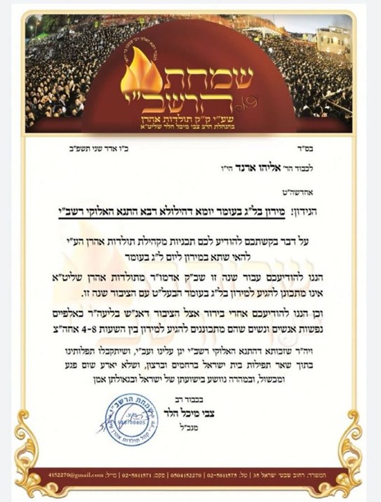 Tzvi Michel Heller, the chairman of Simchas HaRashbi, sent a letter to Eliyahu Erend, the Chareidi adviser to the Meron project manager Tzviki Tessler, informing him of the decision.
