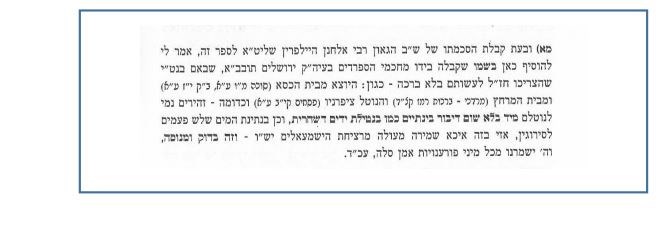 In the sefer, the Rebbe had written that he asked permission from HaGaon HaRav Elchanan Halperin, z’tl, of London to publicize the segulah he told him in name of the chachmei Sephardim in Yerushalayim. The segulah is that when one is required to wash netilas yadayim without a bracha, such as leaving the bathroom or cutting his nails, he should be careful to immediately wash his hands thoroughly, three times on each side, without talking in between. “This is an excellent shemirah from murder by Yishmaelim – it’s tried and tested,” the Rebbe wrote.