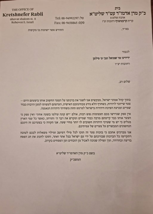 The Kretshnefer Rebbe, a resident of the city of Rechovot where Yamina MK Idit Silman lives, sent a letter to her and her husband Shmulik on Wednesday night, following Idit’s resignation from the coalition due to state religious issues.