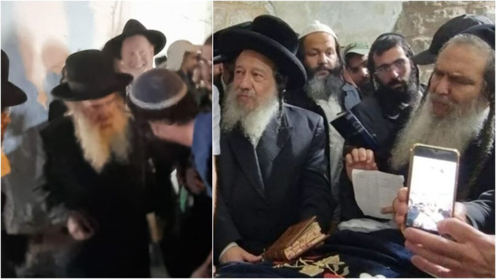 HaGaon HaRav Mordechai Gross arrives at Kever Yosef HaTzaddik. (L.); The Zhviller Rebbe and HaRav Shalom Arush at Kever Yosef HaTzaddik.