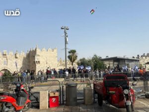 As thousands of Jews gathered at Sha’ar Shechem for the Jerusalem Flag Parade on Sunday, a drone with a PLO flag was seen flying in the air above the participants.