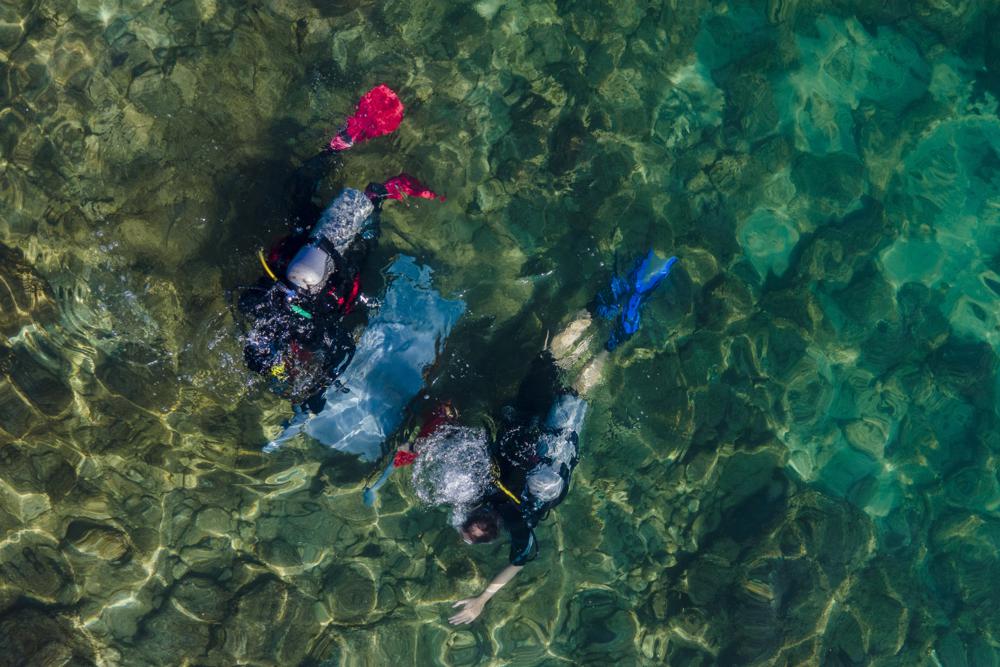 Scuba-diving volunteers collect trash during World Ocean Day event in the Mediterranean ancient Caesarea's Roman-period port, Israel, Friday, June 10, 2022. Divers visiting the ancient seaport of Caesarea on Israel's Mediterranean coast occasionally find treasure, but on Friday they searched for trash. Twenty six scuba-diving volunteers removed around 100 pounds (45 kilograms) of garbage from between the sunken pillars and submerged ruins of the historic site as part of a United Nations World Oceans Day initiative. (AP Photo/Ariel Schalit)