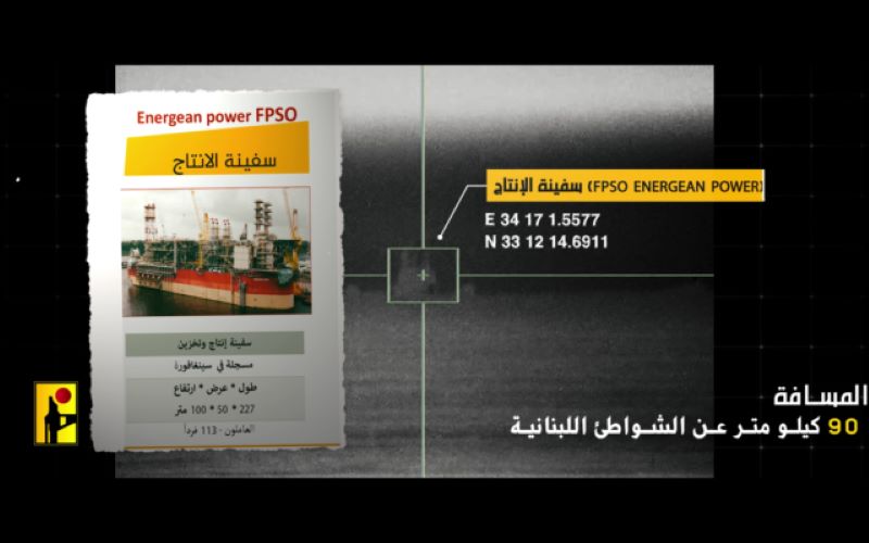 The video then shows photos taken from reconnaissance drones of the Karish gas rig and other ships and their coordinates. It ends with one final Hebrew word of warning: בטווח – “within range.”
