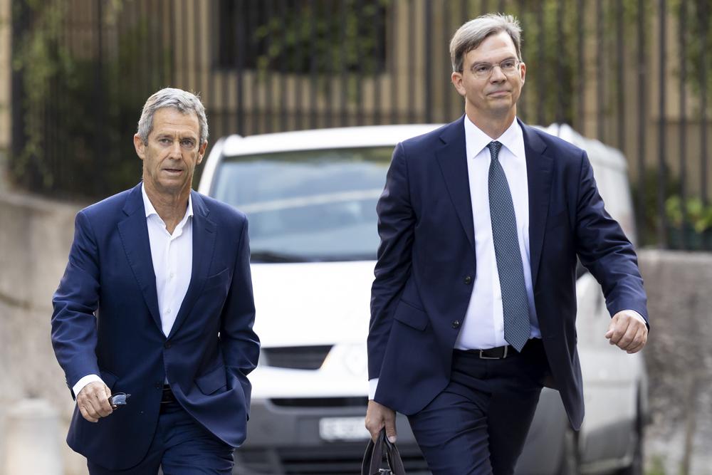 Israeli diamond magnate Beny Steinmetz, left, with his lawyer Daniel Kinzer arrives to a courthouse in Geneva, Switzerland, Monday, Aug. 29, 2022. Steinmetz returns to a Geneva courthouse on Monday to appeal his conviction on charges of corrupting foreign public officials and forging documents, a case linked to his firm's bid to reap lavish iron ore resources in the west African country of Guinea. (Salvatore Di Nolfi/Keystone via AP)