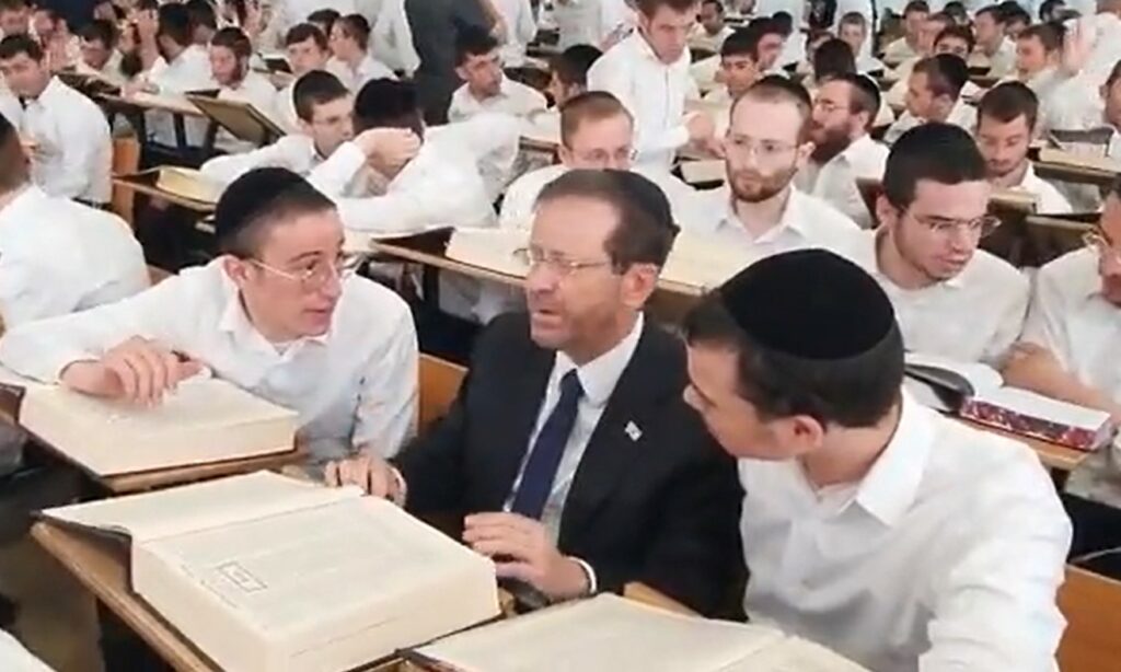 While visiting Yeshivas Torah B’Tifarta, a large yeshivah with over 1,000 bochurim, Herzog sat on the bench with the bochurim and joined in the pilpul on Masechtas Bava Metziah, learning b’iyun for an hour’s time.