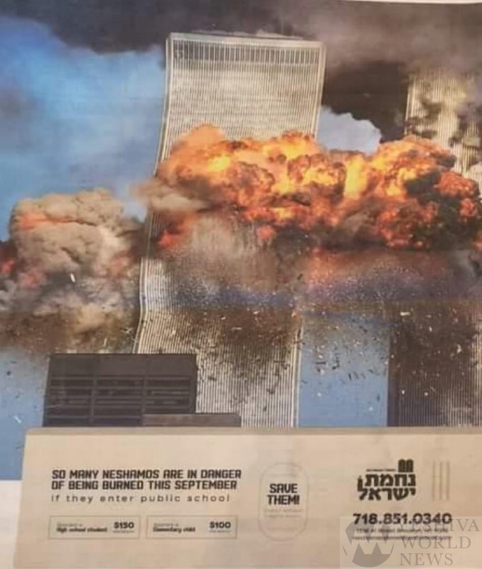 The ad shows a photo from 9/11/2001, specifically the moment United Airlines Flight 175 was flown into the south tower and exploded in a massive fireball. The ad’s text says, “So many neshamos are in danger of being burned this September” with smaller letters below it saying, “if they enter public school.”