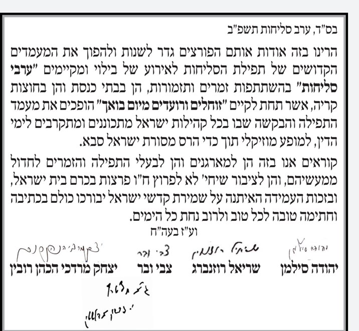 Senior Ashkenazic rabbanim in Eretz Yisroel have signed onto a letter decrying the recent practice of shuls making “musical selichos” with singers and instruments.