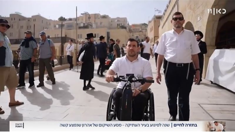 Kan News arranged for Aharon to return to the scene of the attack, where he thanked his rescuers and davened at the Kosel for the first time since he was injured. Aharon and his wife and parents expressed their appreciation to the police officer who shot the terrorist and the medic, who described how she pleaded with Aharon at the time to stay alive as she attempted to stop the bleeding, and her joy at hearing that he had survived against all odds.