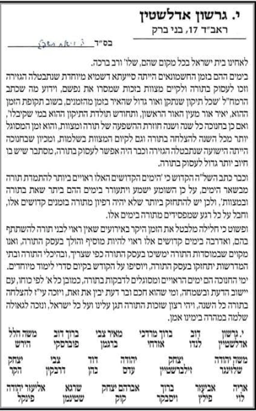 HaRav Edelstein added the words of the Shelah HaKodesh that “‘these days are the most appropriate of all days for hasmadah b’Torah and therefore one should arouse himself with great vigor during these days in Torah and mitzvos.’ And therefore one should greatly strengthen himself that he shouldn’t become lax in Torah during this kodesh time, and chaval on every moment of missed Torah during these days.”