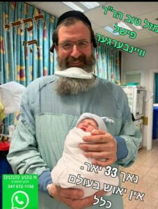 HaRav Weinberger, a 52-year-old Bobover chassid, got married in Brooklyn in 1988. After being married for many years without being zohech to zera shel kayama, the couple moved to Eretz Yisrael 11 years ago – partially due to a promise they received that they would have a baby boy if they moved to Eretz Hakodesh.