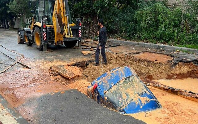 The owner of the car, Chaim Boron, a resident of the city, described what happened to Ynet: “I was driving when I saw a small half-meter hole but it quickly turned into a flood and within a second, my car sunk. It all happened within an instant. The front tires fell inside the sinkhole. I fled the car within 20 seconds. The car continued to sink – if I wouldn’t have fled, I would have sunk with it.”
