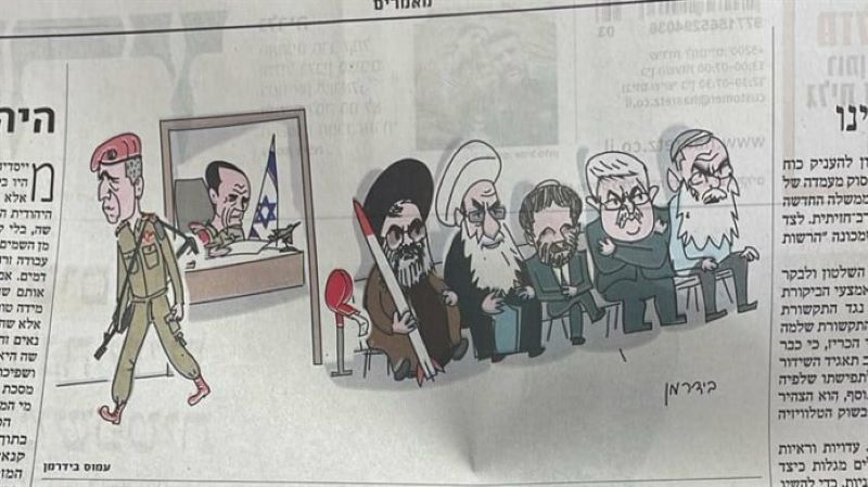 The Israeli left-wing Haaretz newspaper published a caricature on Tuesday morning in which Finance Minister Betzalel Smotrich is pictured sitting together in a row with Supreme Leader of Iran Ali Khamenei, Hezbollah chairman Hassan Nasrallah, and Palestinian Authority President Mahmoud Abbas.